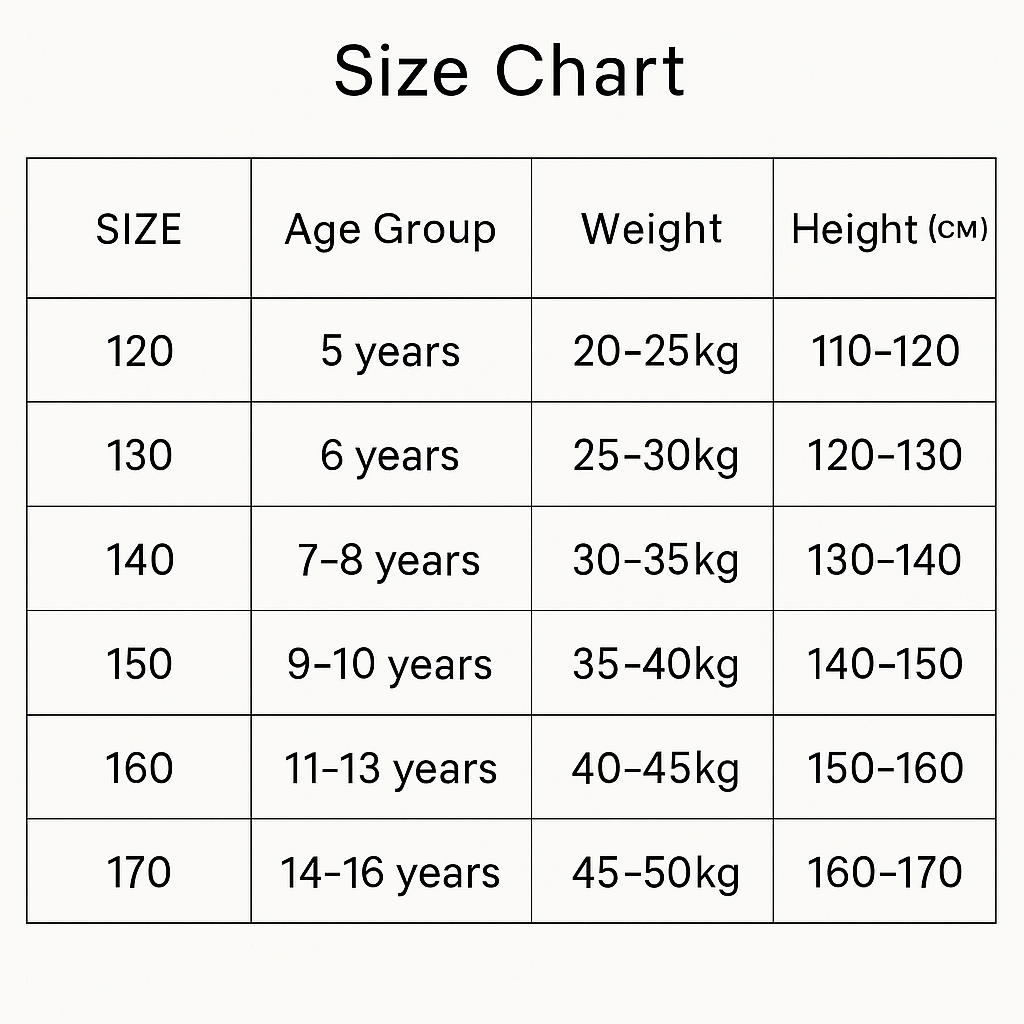 | Size | 4 Years, 5 Years, 6 Years, 7 Years, 8 Years, 9 Years, 10 Years, 11 Years, 12 Years, 13 Years, 14 Years |