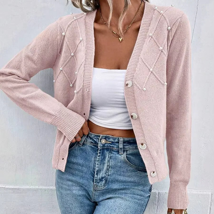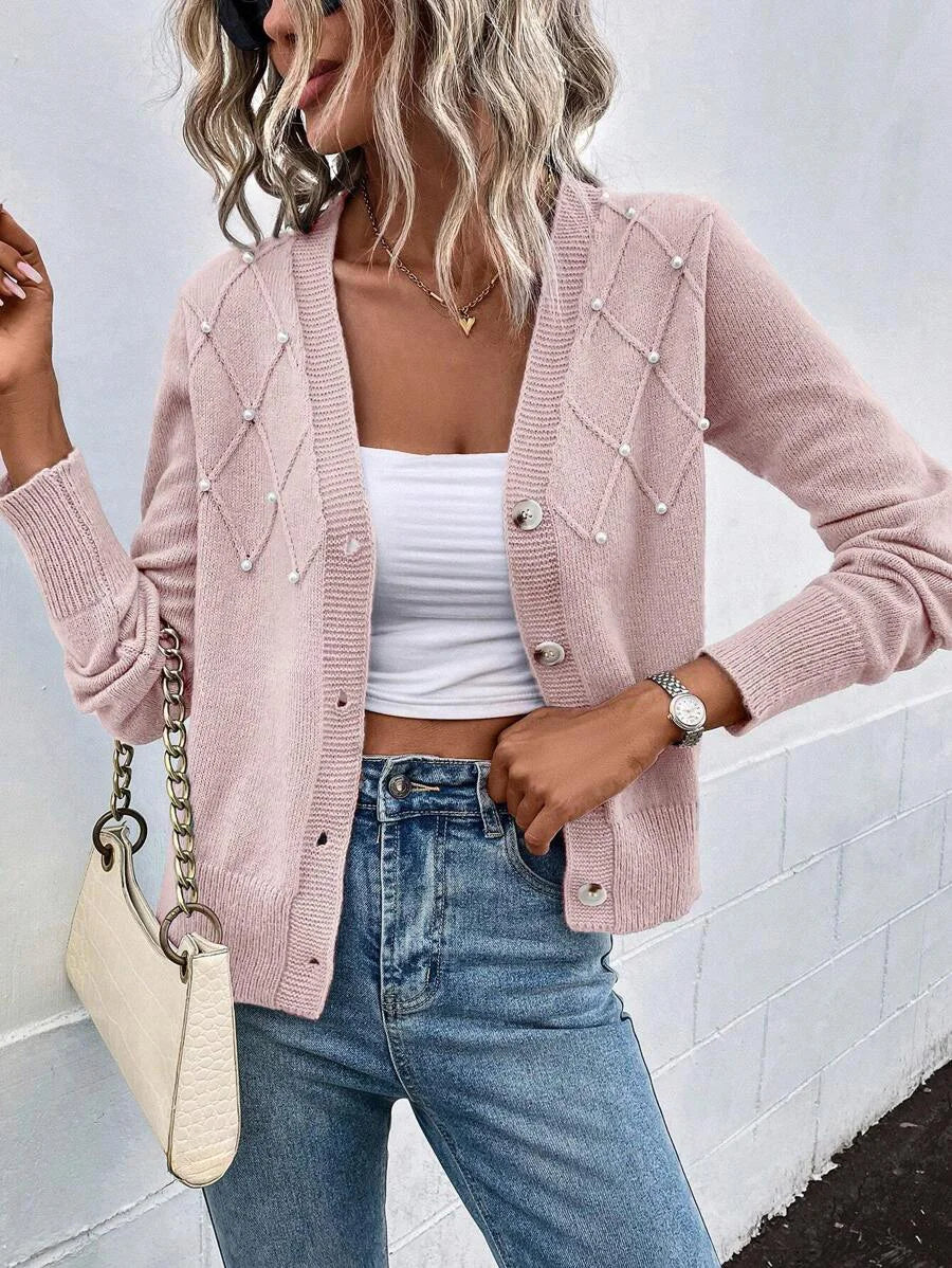 Add a touch of elegance to your everyday style with this beautifully crafted beaded knit cardigan. Designed with a flattering V-neckline and chic lantern sleeves, it blends comfort with standout details. The subtle beading elevates this piece, making it versatile enough for both casual outings and special occasions.