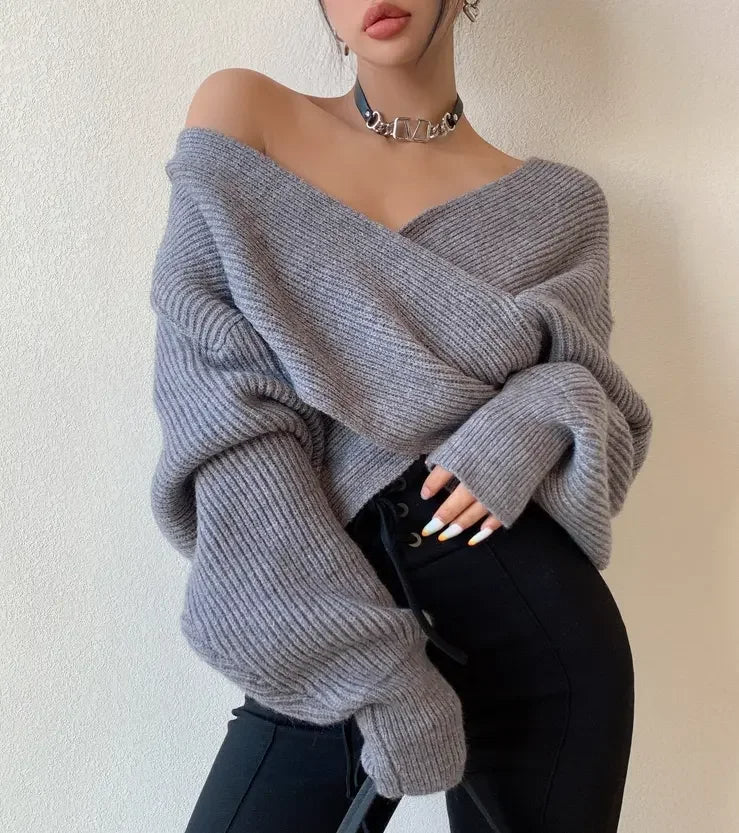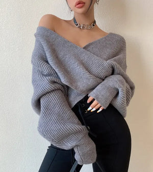 Women’s Sexy One-Shoulder Cross V-Neck Knit Sweater