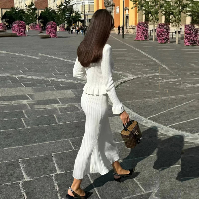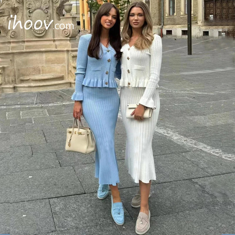 - Design: Two-piece set with V-neck top and maxi skirt, regular fit