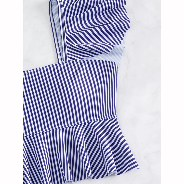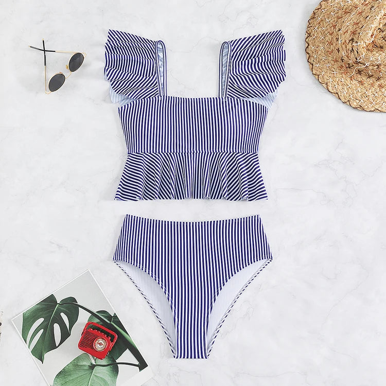 Striped Ruffle High Waist Backless Bikini Swimsuit