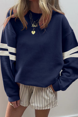 Elevate your casual wardrobe with this women’s oversized crewneck varsity sweatshirt. Perfect for chilly fall and winter days, its breathable fabric and bold arm stripes offer effortless style and comfort.