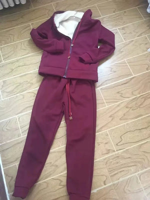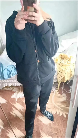 Stay cozy and stylish with this women’s plush 2-piece sports and leisure set, featuring a hooded jacket and pants in a solid color. Perfect for fall and winter, its warm polyester blend ensures comfort for active or casual days.