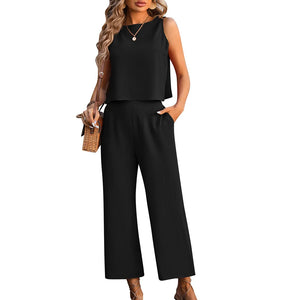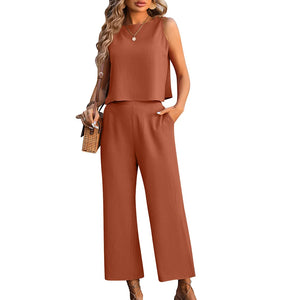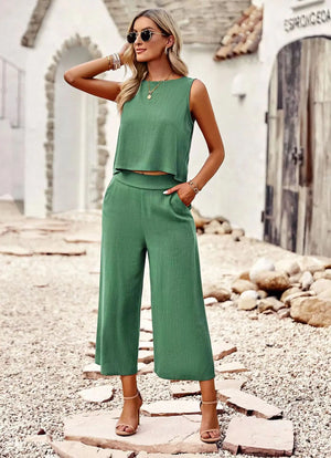 Stay cool and stylish with this comfortable 2-piece set, featuring a sleeveless crop tank top and long, loose-fitting track pants. Perfect for casual outings, lounging at home, or weekend getaways, this versatile set combines breathable linen fabric with a relaxed fit for easy summer wear.