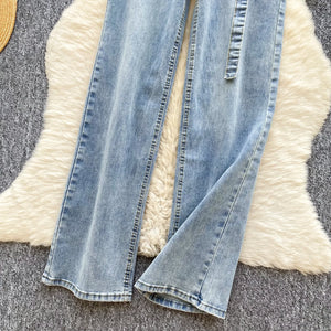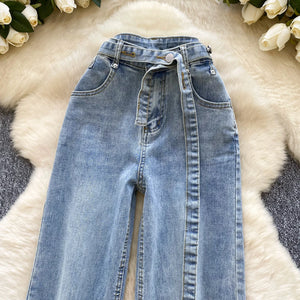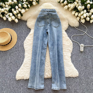 Elevate your wardrobe with these women's high-waist denim jeans, designed for a flattering straight fit. Crafted from a breathable polyester and cotton blend, these jeans feature a worsted fabric that resists wrinkles, pilling, and static while offering waterproof and windproof protection. Perfect for casual outings, work, or everyday stylish wear.