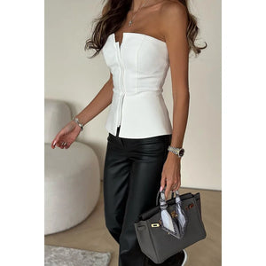 Turn heads with this women's fashionable one-collar tank top, crafted from a soft polyester and cotton blend for eco-friendly comfort. Featuring a sexy slim fit with a zipper detail and vibrant yarn-dyed fabric with discharge printing, this regular-length top is perfect for casual outings, parties, or bold everyday looks.