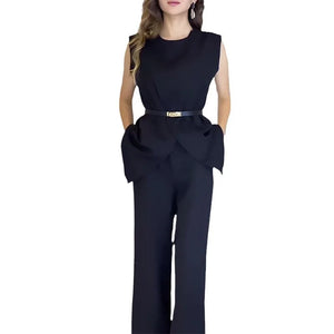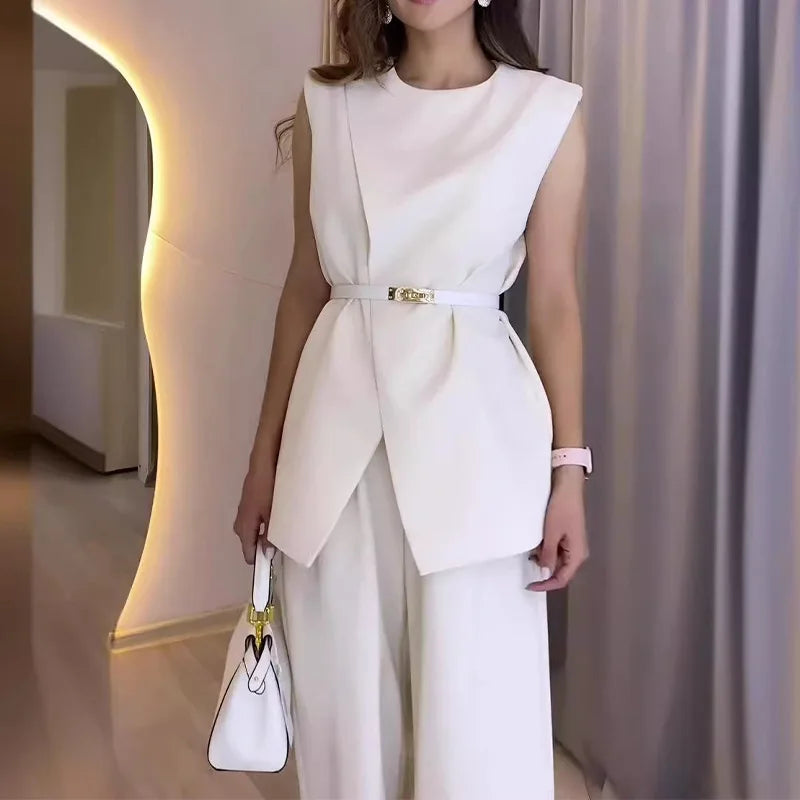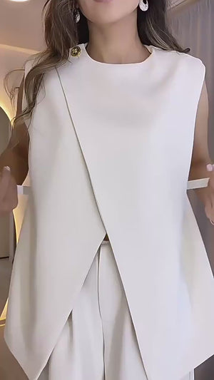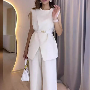 Elevate your everyday style with this chic wide-leg suit set. Designed for comfort and versatility, the sleeveless top with an O-neck pairs perfectly with the full-length trousers, creating a polished yet relaxed look. Crafted from a durable polyester-cotton blend and canvas fabric, this set is ideal for daily wear, offering a regular fit that flatters any body type. Whether for work or casual outings, this ensemble is your go-to for effortless elegance.