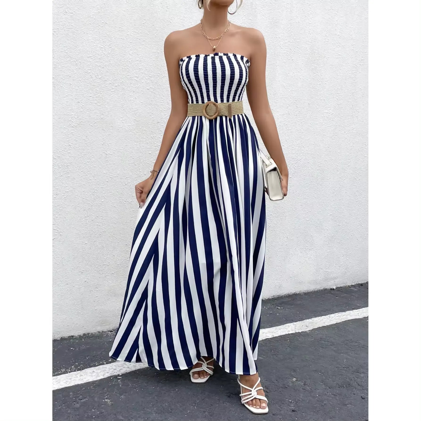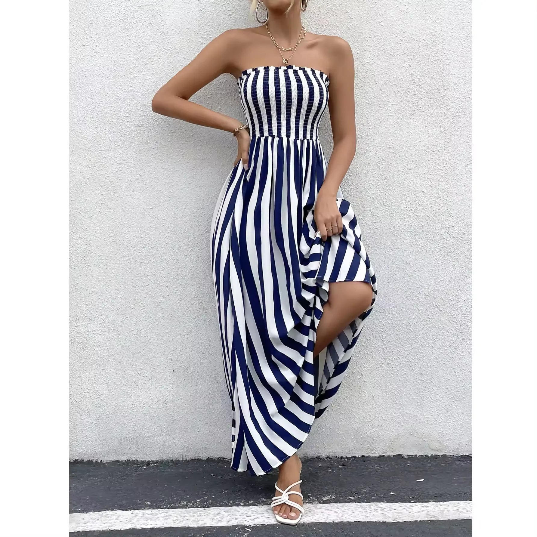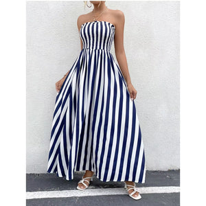 Home Dresses Elegant Blue & White Draped Striped Maxi Dress