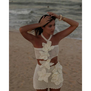 Add a touch of playful elegance to your wardrobe with this strapless mini dress featuring 3D flower detail. Crafted from soft, breathable knitted polyester, it’s designed with a halter neckline and loose silhouette for comfort and style. The statement floral embellishment brings a romantic, eye-catching element, making it perfect for parties, vacations, or stylish day outings.