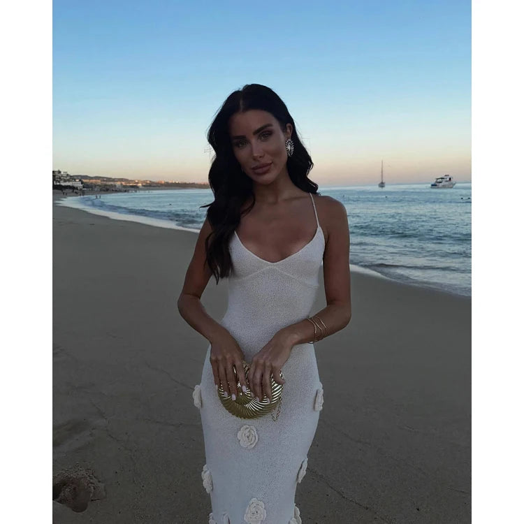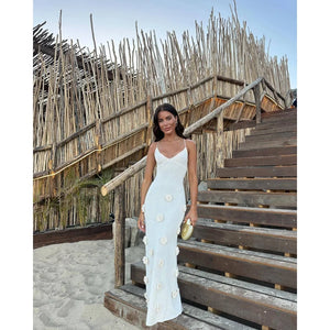 Bring effortless elegance to your wardrobe with this V-neck maxi dress featuring 3D flower detail. Made from breathable cotton with delicate embroidered accents, it offers a loose yet flattering silhouette with a cinched waist for shape. The sleeveless design and floor-length cut make it perfect for warm days, while the floral embellishment adds a romantic, standout touch.