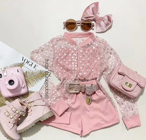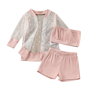 Dress your little one in elegance and comfort with this 3-piece girls' clothing set! Featuring a long sleeve tulle dots coat, a sleeveless knitted vest top, and matching shorts, this outfit is perfect for casual outings, parties, or special occasions. Made from a soft polyester-cotton blend, it ensures breathability and comfort while keeping your child stylish.