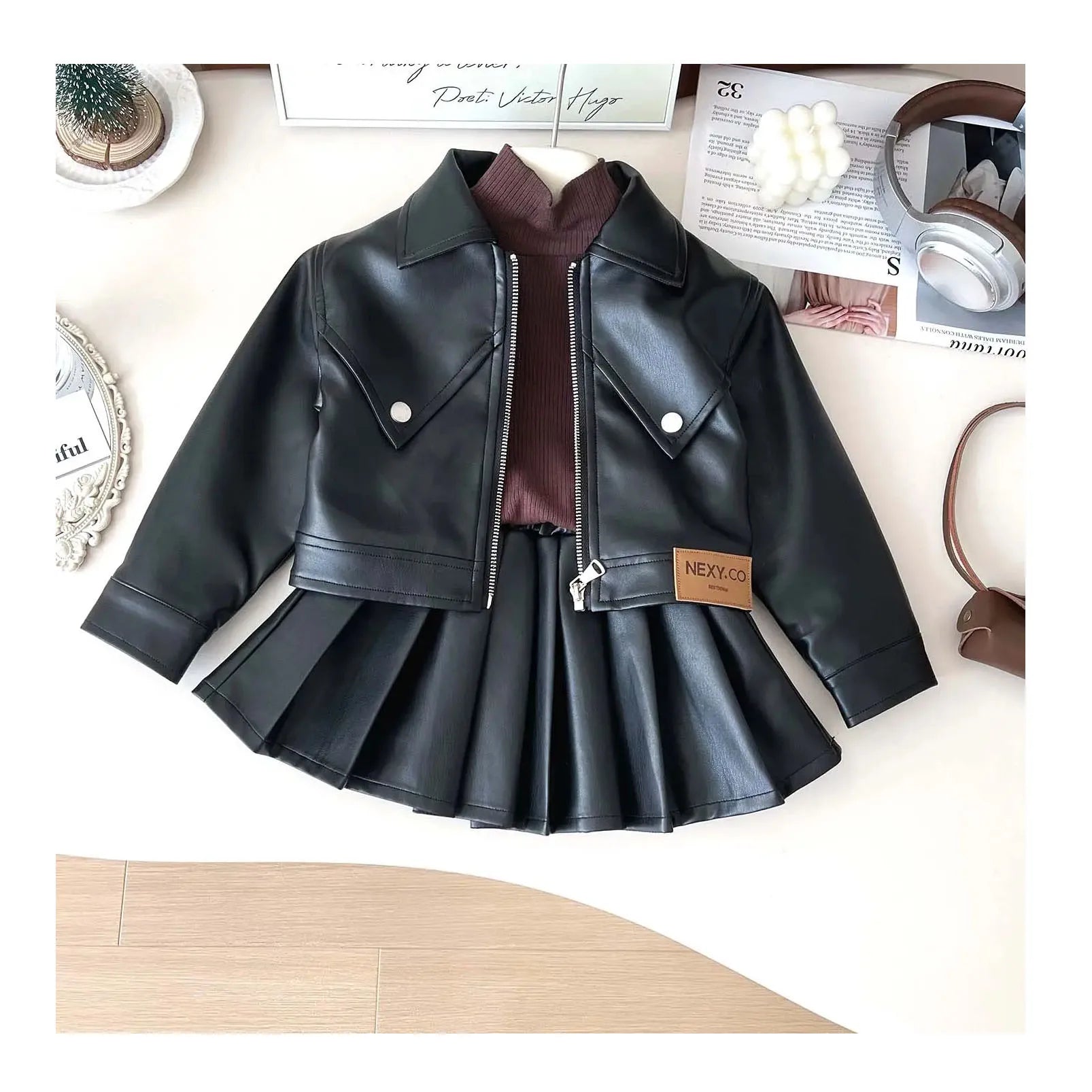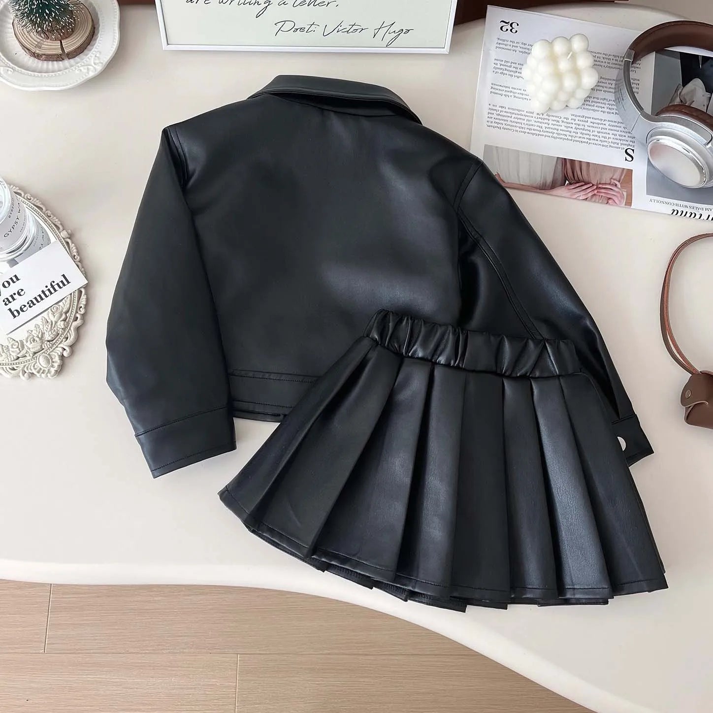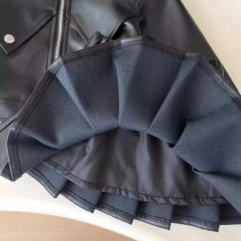 Girls’ PU Leather Jacket and Skirt Set