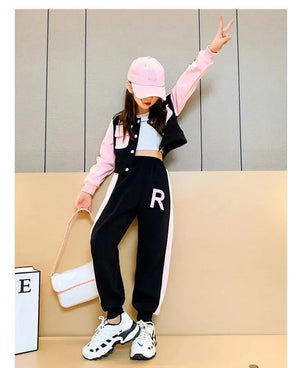 Trendy Letter Print: Baseball jacket and pants for a cool, coordinated look.