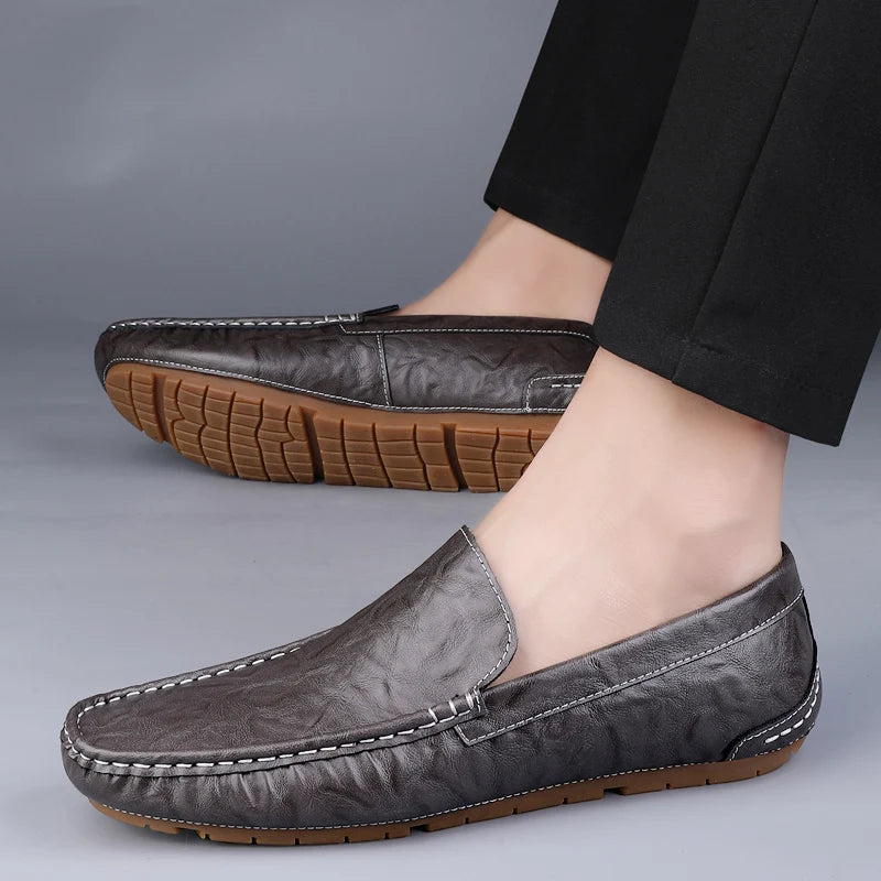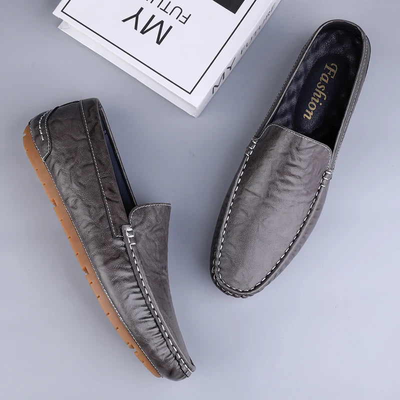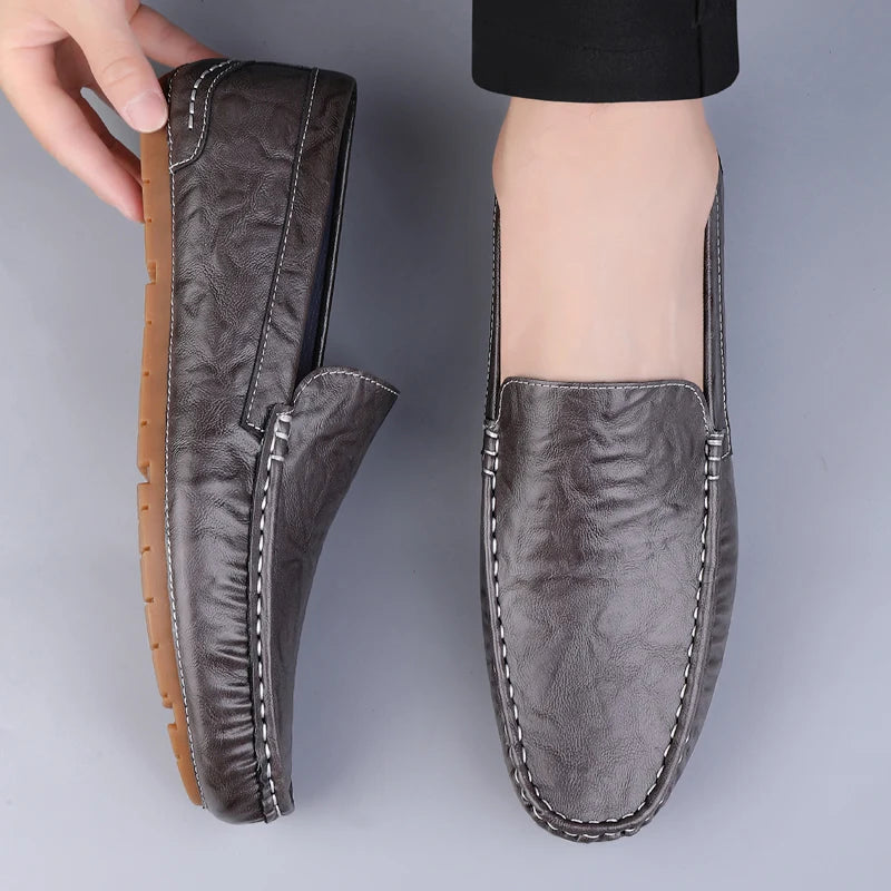These driving loafers are crafted from premium cow leather, designed to offer breathable cushioning and a lightweight feel. The slip-on design lets you slide in effortlessly while the EVA midsole and rubber outsole deliver reliable anti-slip grip—perfect for city streets or casual outings. Classic round toe and a sleek silhouette make these loafers a versatile essential for every season.