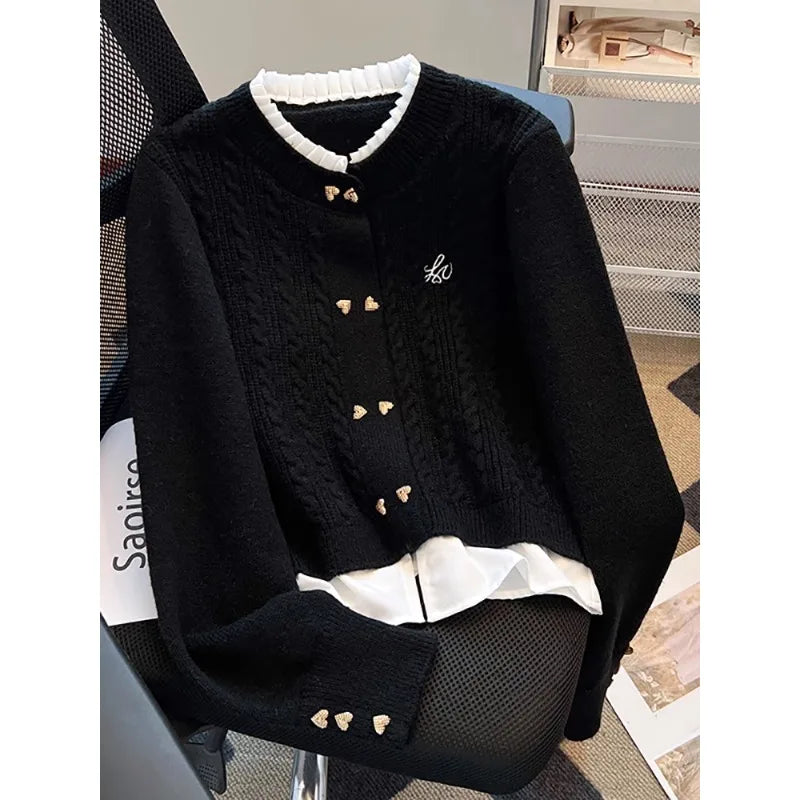 Women Fashion Stand up Collar Fake Two-piece Long Sleeved Knitted Cardigan