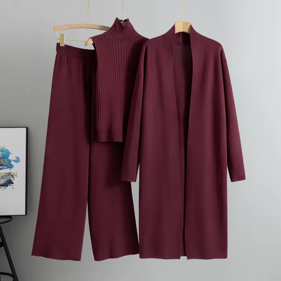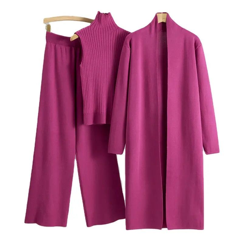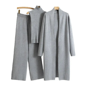 Stay effortlessly stylish with this elegant three-piece knitwear set. Designed for both comfort and sophistication, this solid-colored ensemble features a long cardigan, matching pants, and a cozy sweater top—perfect for layering in any season. Whether you're lounging at home or stepping out for a casual day, this set brings a chic, put-together look with minimal effort.