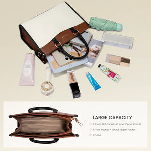 - Design: Fashion-forward tote with single handle and zipper/hasp closure