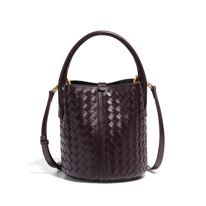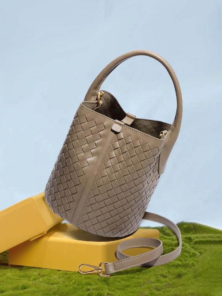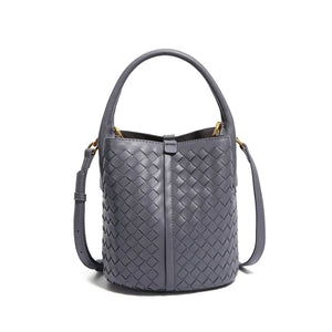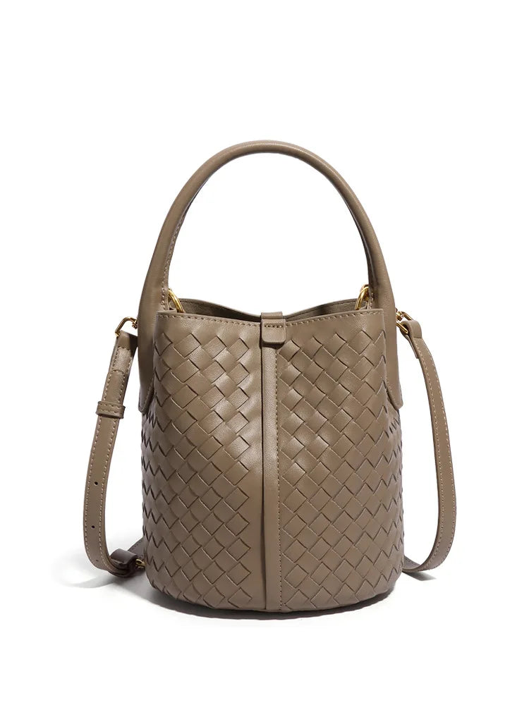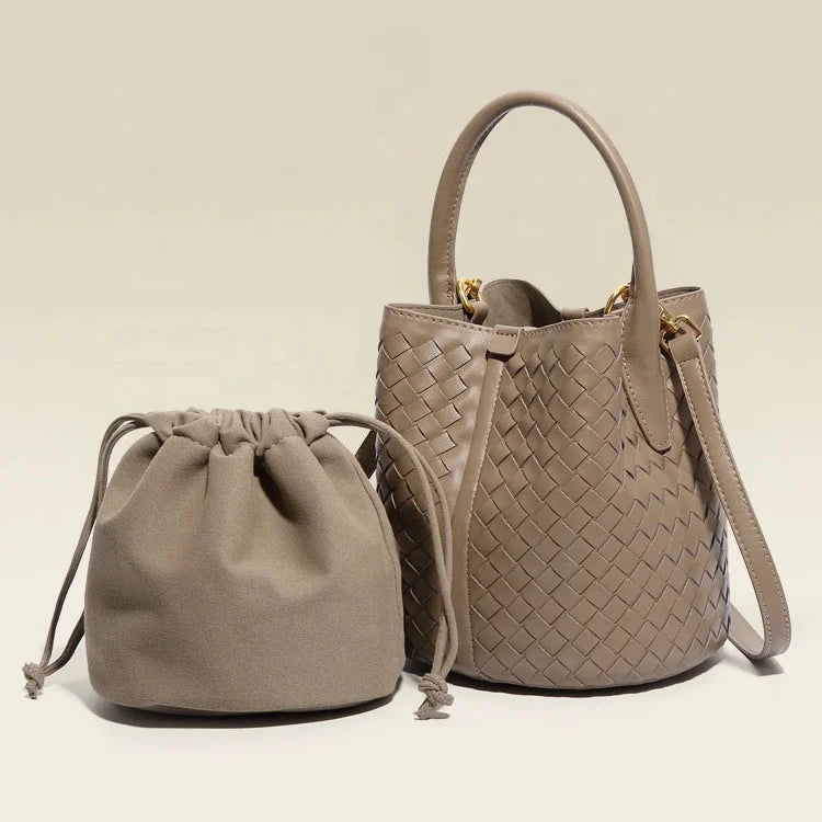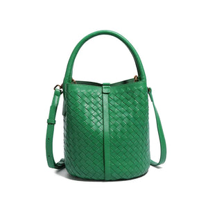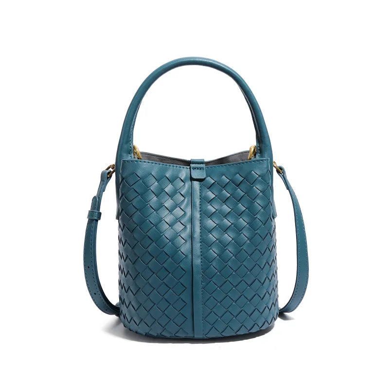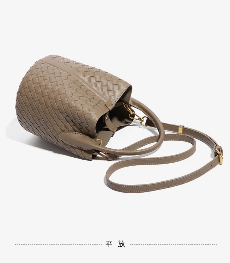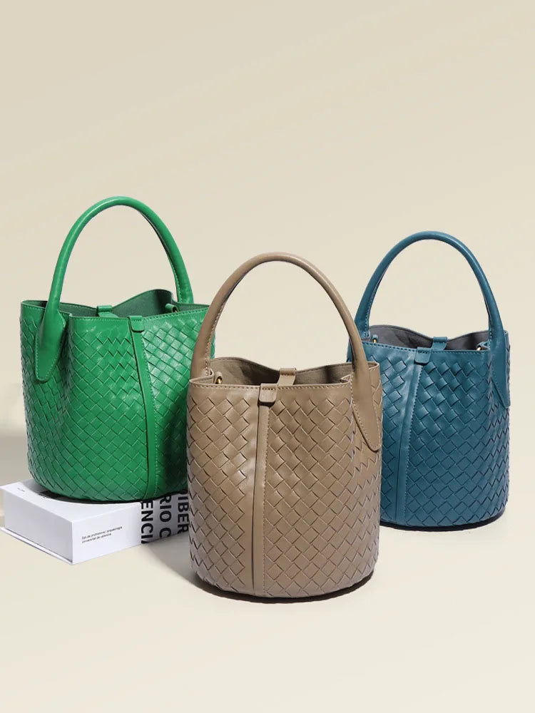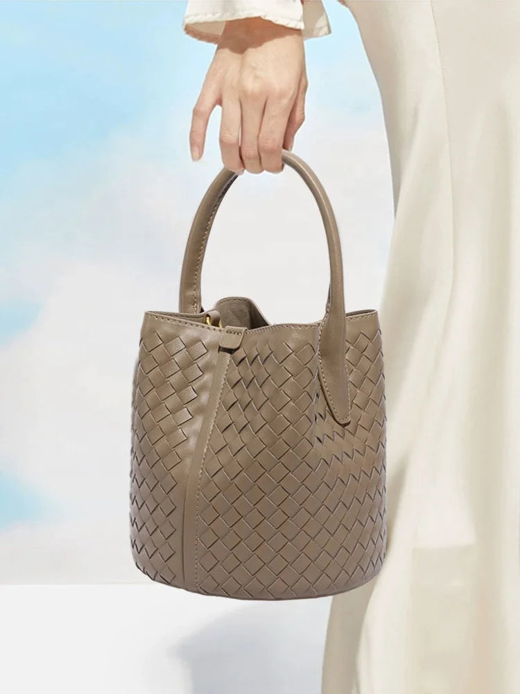 This fashionable hand-woven bucket bag combines style and durability, perfect for everyday use or special occasions. Crafted from high-quality PU leather, it features a stylish flap design with a secure hook-and-loop closure. The bag comes with two sturdy handles for easy carrying and a soft polyester lining for added comfort. This versatile and chic accessory complements any outfit, making it an essential addition to any woman's wardrobe.