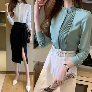 Spring Korean Style Shirt Womens Design Fashion Style Long-sleeved Temperament Stand-up Collar Shirt Summer Casual Polyester