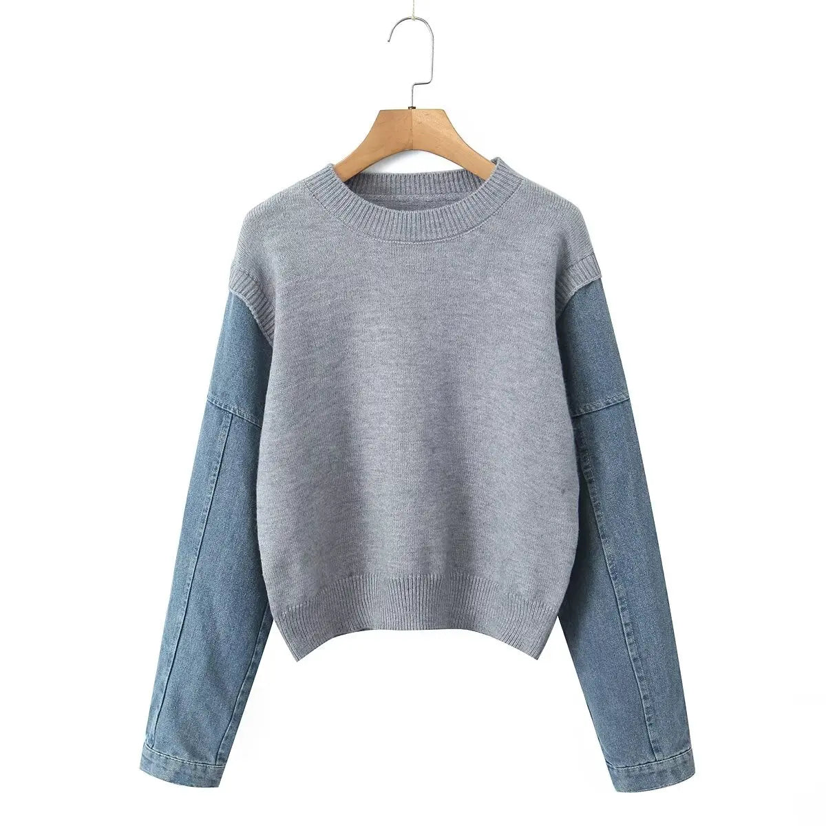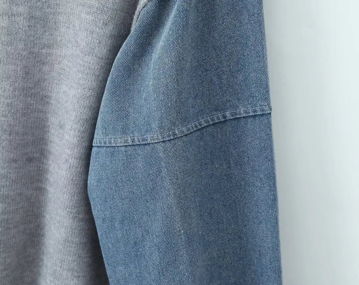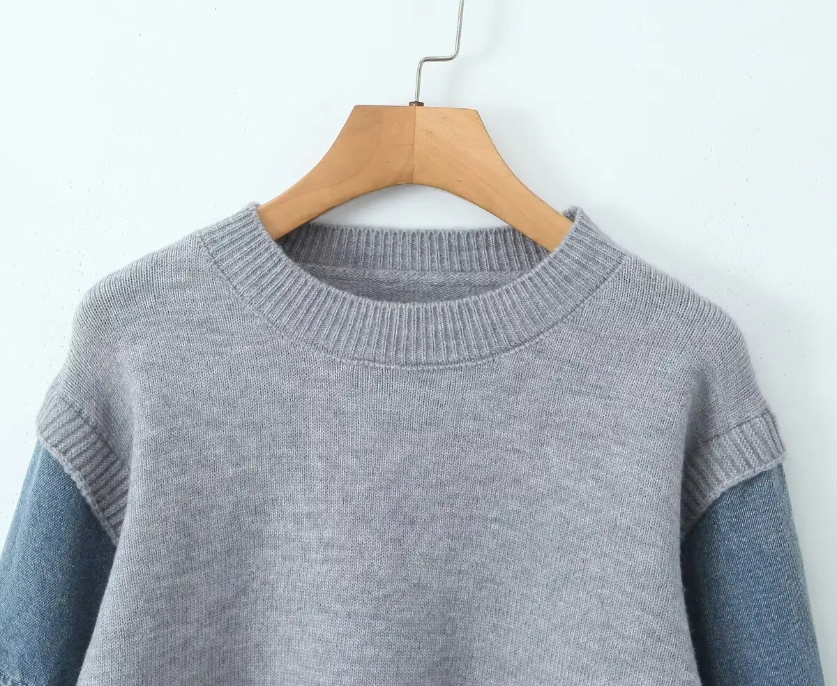 Women’s Denim Sleeve Knitted Pullover Sweater