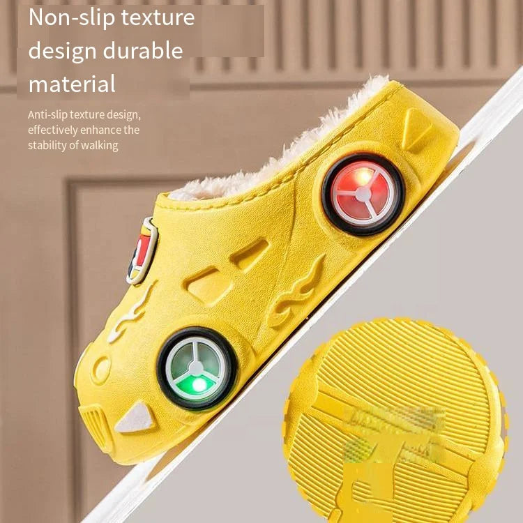 Light up your child’s steps with these Kids’ Winter LED Light-Up Slippers, fun unisex car-shape house shoes perfect for winter, spring, and autumn. Featuring a waterproof PVC upper, midsole, and outsole with a cozy plush lining, these cartoon-patterned slippers offer warm comfort and durability for indoor and outdoor play. The LED lights in the outsole add a playful glow, while the lightweight design ensures easy movement. Ideal for school runs, backyard adventures, or cozy evenings, these slippers blend style and practicality for boys and girls.
