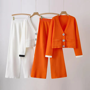 Step into effortless elegance with this Women’s Chic Knit Two-Piece Set, a stylish fall outfit featuring a V-neck long-sleeve top and full-length wide-leg pants. Crafted from a premium 120-gram polyester-cotton blend with a yarn-dyed knitted texture, this regular-fit set showcases a modern patchwork design for vibrant, lasting color. Its breathable, quick-dry, anti-pilling, anti-static, and eco-friendly fabric ensures all-day comfort and durability, perfect for lounging, errands, or casual outings. Pair with sneakers or boots for a chic, versatile look that blends cozy simplicity with trendy flair.