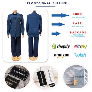 Elevate your fall wardrobe with this women’s two-piece denim set, blending casual comfort with elegant streetwear style. Crafted from a breathable, eco-friendly polyester-cotton blend with a washed denim finish, this set features a long-sleeve top and straight-leg pants adorned with pockets and lace-up details. The solid-color design, enhanced by subtle logos on the front, back, sleeves, lower hem, and back neck, offers a chic, versatile look. Perfect for autumn outings, office days, or casual vibes, pair with boots or sneakers for effortless sophistication.