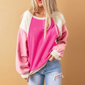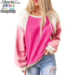 Brighten your fall wardrobe with this women’s hot pink color block sweatshirt. Its bold design and cozy drop-shoulder fit make it a standout choice for casual autumn days, offering breathable comfort and vibrant style.