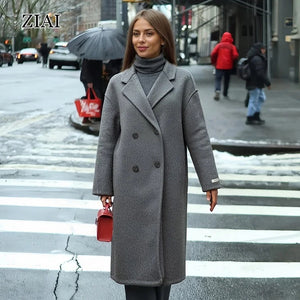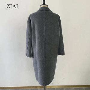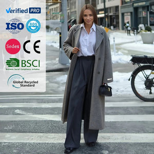 Elegant Double-Faced Design: Long gray peacoat for versatile, stylish layering.