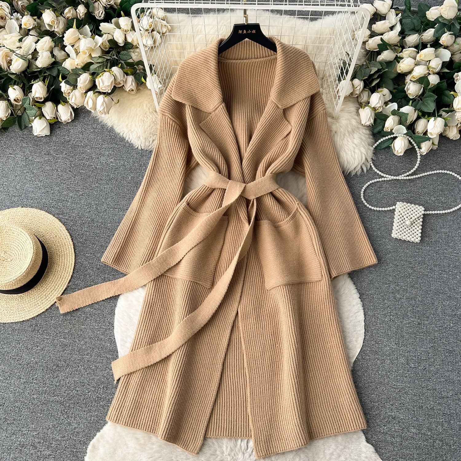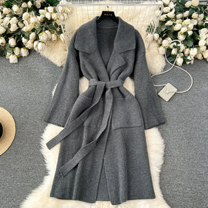 Embrace timeless warmth with this Women’s Loose Knit Cardigan Coat, a mid-length sweater designed for casual sophistication in autumn and winter. Crafted from a soft polyester-cotton blend shell with a smooth polyester lining, this pullover features a woven, yarn-dyed solid-color texture, a turn-down collar, and a sash belt for a customizable, flattering fit. Its standard-thickness knit, anti-wrinkle, anti-shrink, and eco-friendly properties ensure lasting comfort and easy care. Perfect for layering over jeans, skirts, or dresses, this versatile coat is ideal for cool days, breezy evenings, or cozy outings.