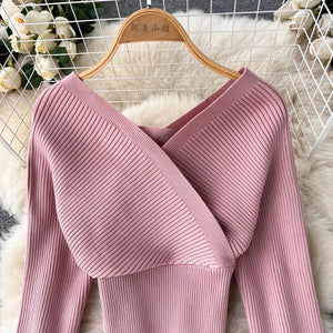 Sparkling Design: V-neck sweater with lantern sleeves and midi skirt for elegant flair.