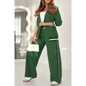 Elegant Striped Design: Subtle stripes on blouse and pants for a chic, coordinated look.