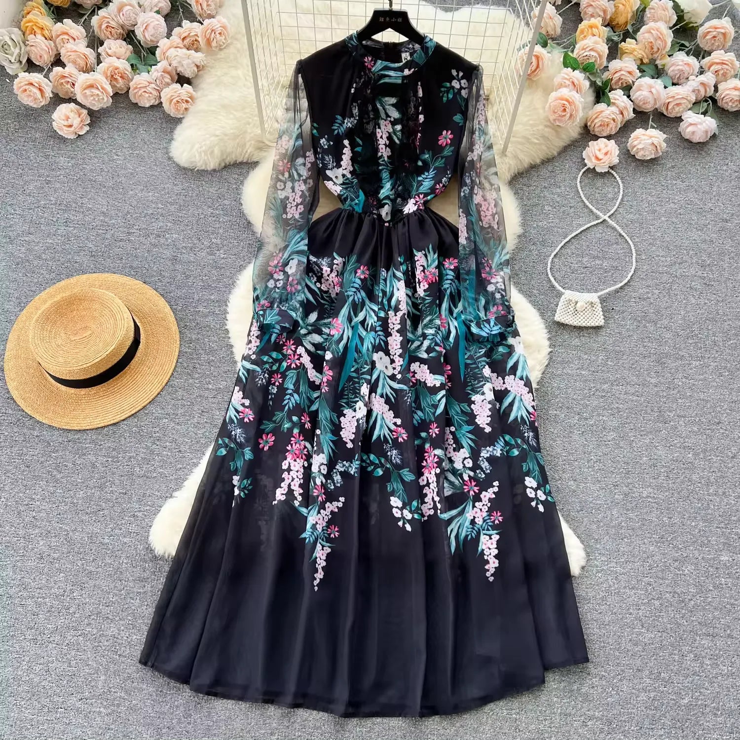 new elegant heavy industry embroidery mesh stitching maxi dress