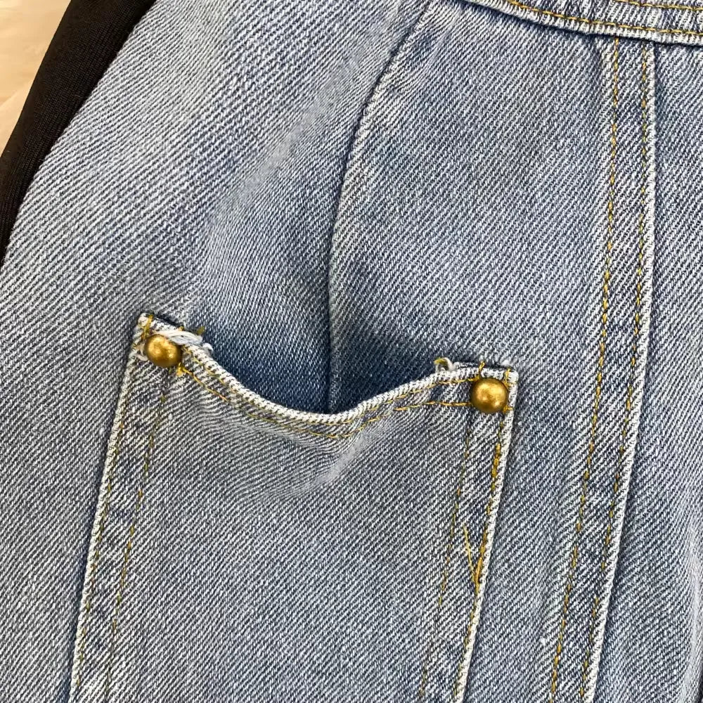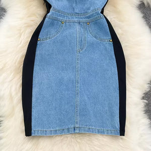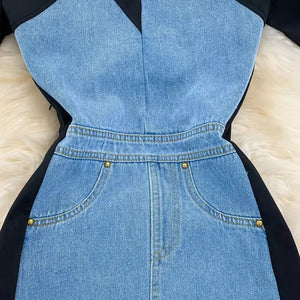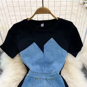 Short Sleeve O-neck Solid A-line Dress Summer Contrast Color Denim High Waist Midi Dress Ladies Casual Dress Clothes Women