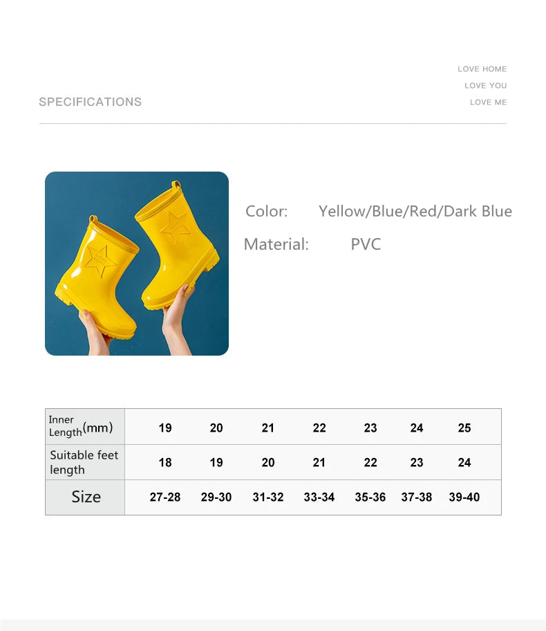 Keep kids’ feet dry and secure with these vibrant PVC rain boots, perfect for winter. Featuring a cozy cotton lining and anti-slip design, they ensure safe, comfortable play in wet weather.