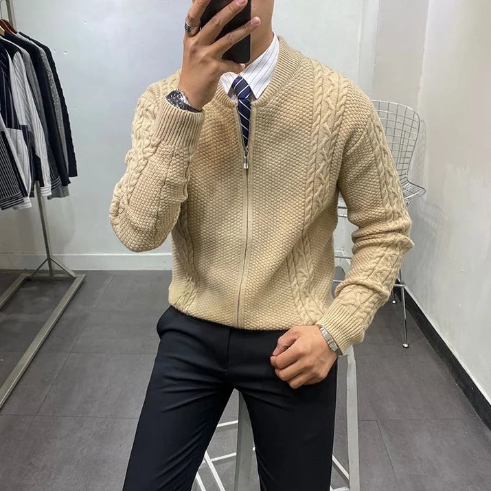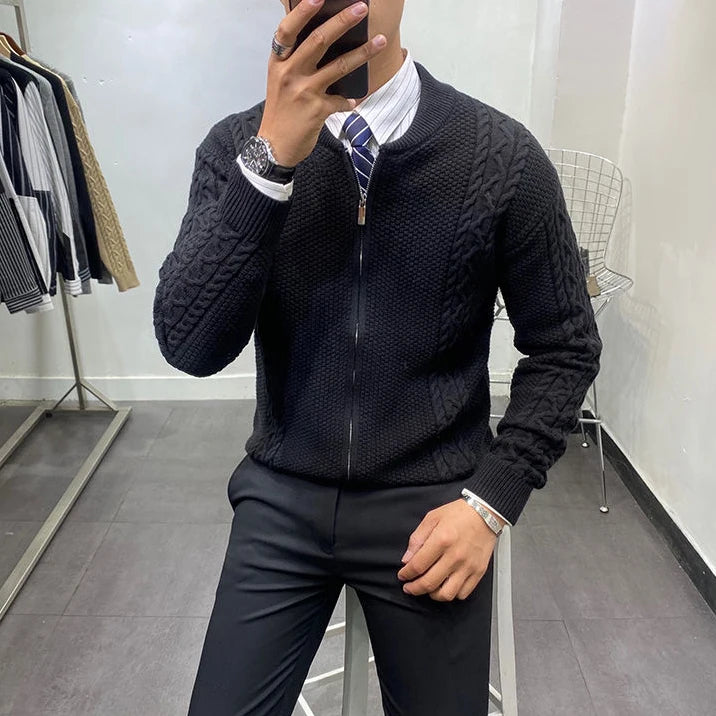 Welcome the autumn chill with this men’s loose elegant zipper cardigan, designed for effortless style and comfort. Made from soft polyester with a machine-knit finish, its relaxed fit and subtle button details create a versatile, polished look ideal for casual fall outings or cozy evenings.