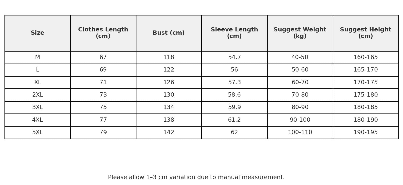 M, L, XL, 2XL, 3XL, 4XL, 5XL |
