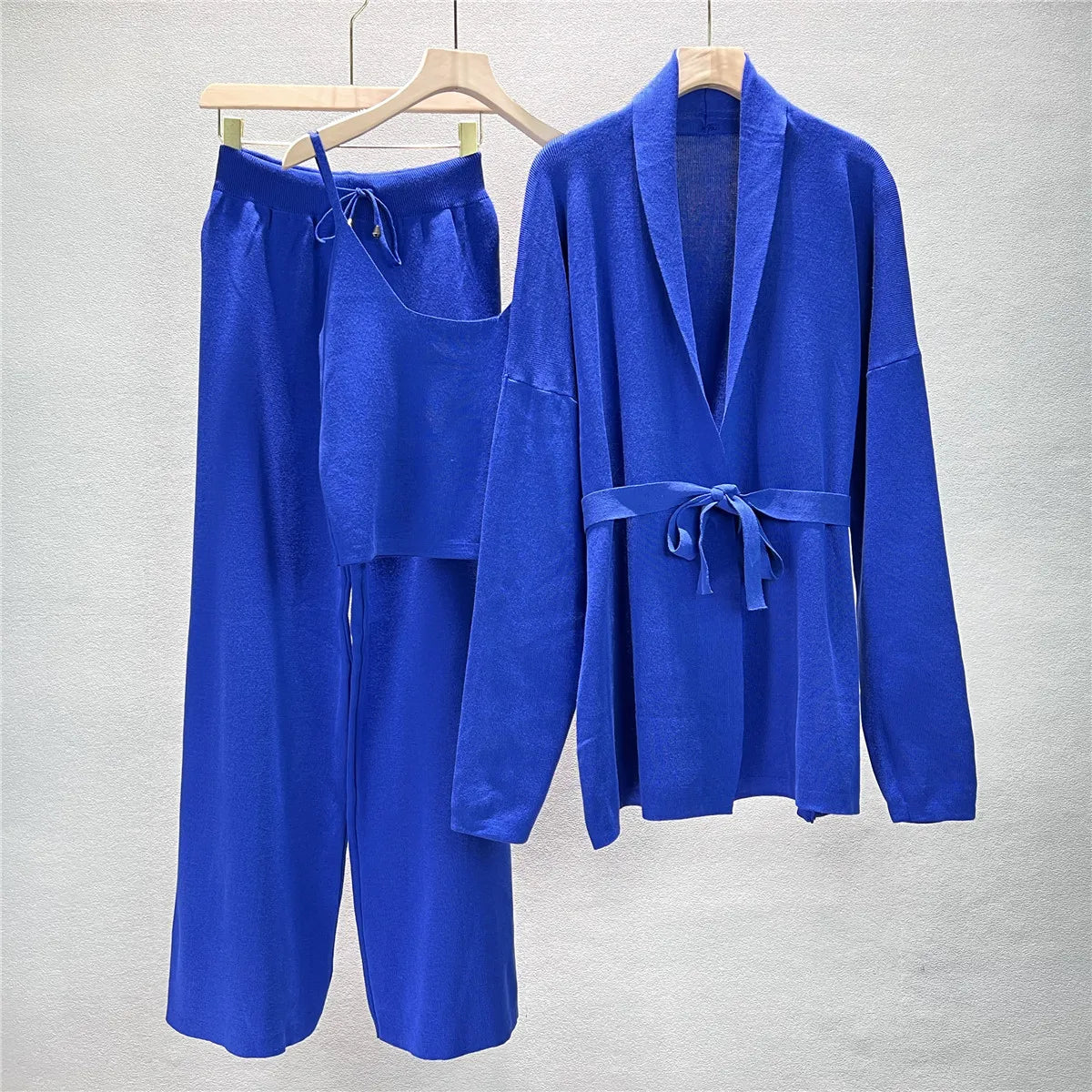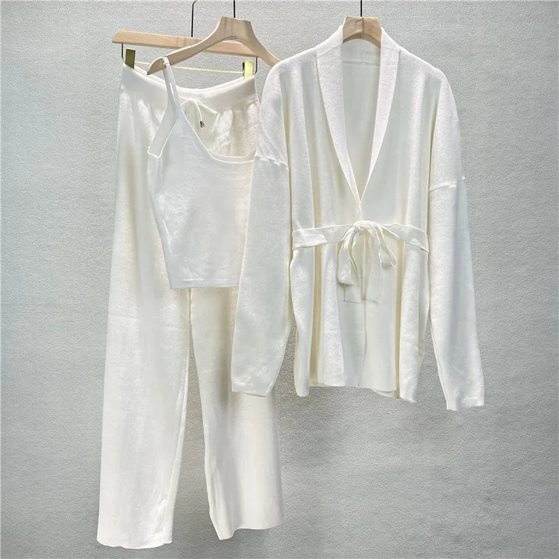 Elegant 3-Piece Design: V-neck cardigan, suspender top, and wide-leg pants for versatile styling.