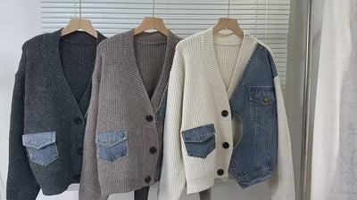 Embrace cozy, eclectic style with this Women’s Denim Patchwork Knit Cardigan, a casual V-neck pullover perfect for autumn and winter. Crafted from a soft 160-gram polyester-cotton blend with a 9-gauge knitted weave, this cardigan features a garment-dyed finish and denim patchwork accents for a vintage-inspired, irregular loose fit. Its breathable, lightweight fabric ensures all-day comfort, while the full-length sleeves and relaxed silhouette make it ideal for layering over jeans, skirts, or trousers. Perfect for casual outings or smart-casual looks, this cardigan blends unique texture with effortless versatility.
