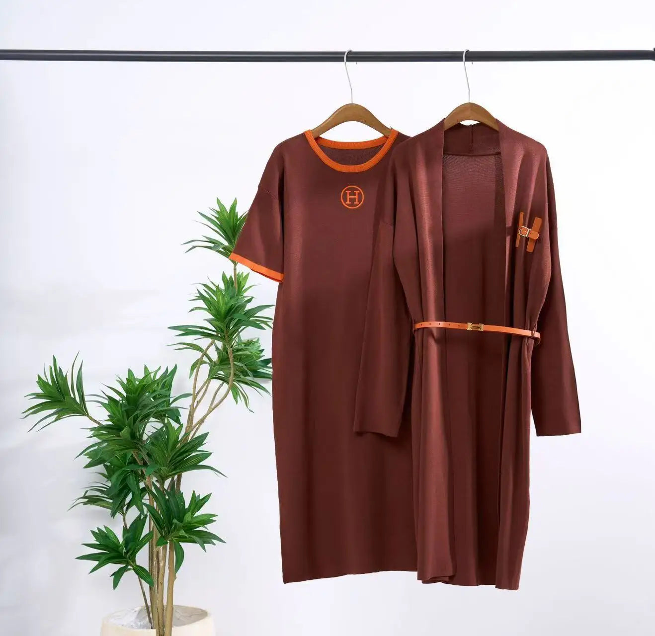 Women’s Knitted Long Cardigan & Belted T-Shirt Dress Set