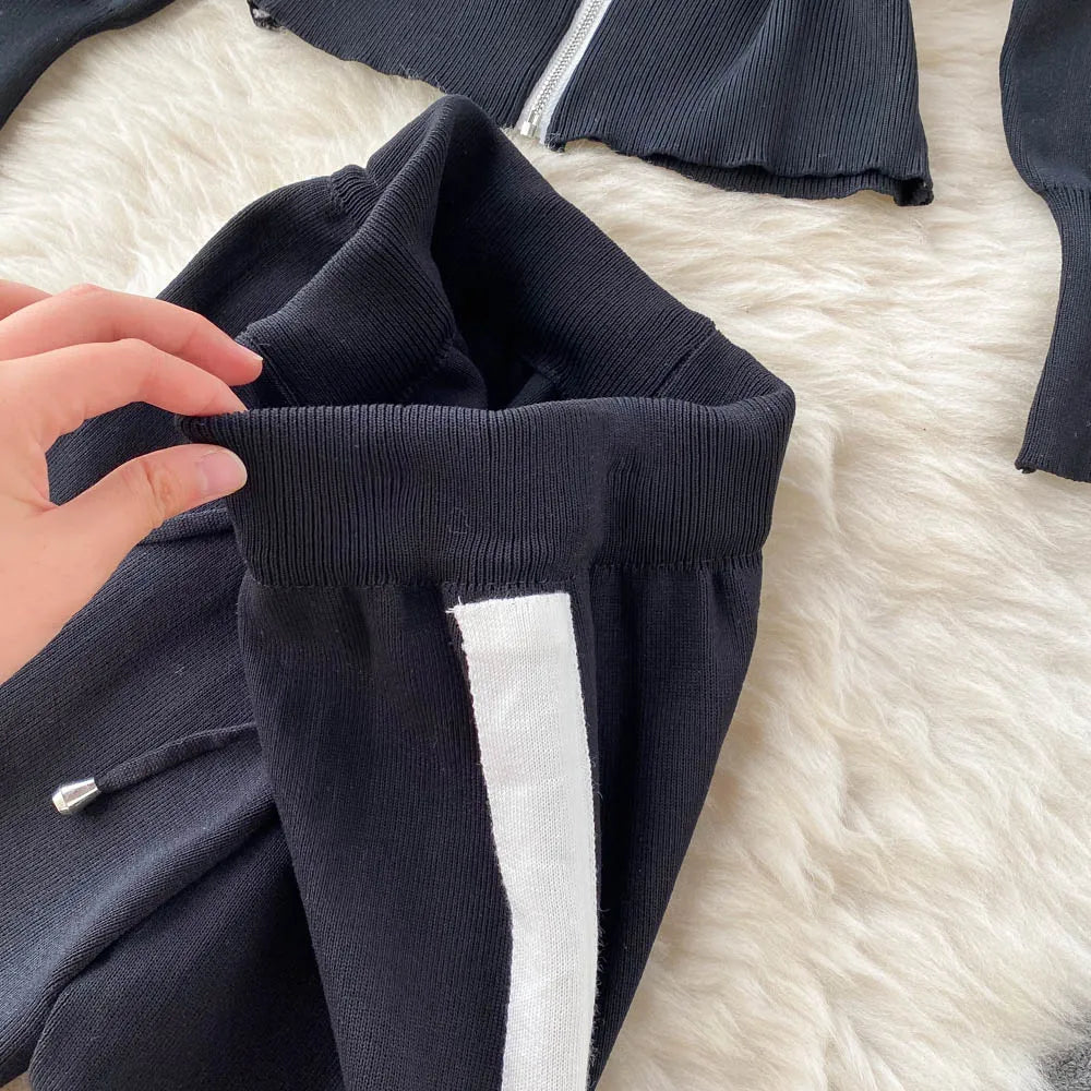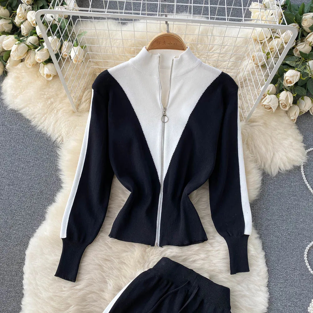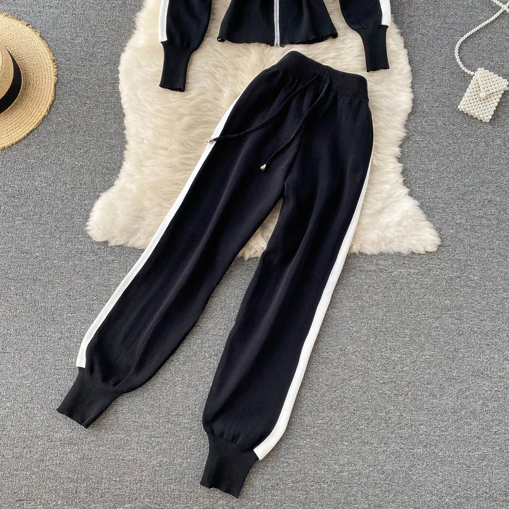 Embrace effortless style with this Women’s Knitted Two-Piece Sweater Set, a cozy lounge tracksuit perfect for fall. Crafted from a premium cotton-polyester blend with a yarn-dyed knitted weave, this regular-fit set includes a long-sleeve crew neck top and matching full-length pants, adorned with a chic patchwork pattern for subtle contrast. Its standard-thickness, anti-pilling fabric ensures lasting smoothness and breathable comfort, while functional pockets add practicality. Ideal for brunches, travel, or relaxing at home, this versatile set pairs seamlessly with sneakers or boots for a cozy, stylish fall look.