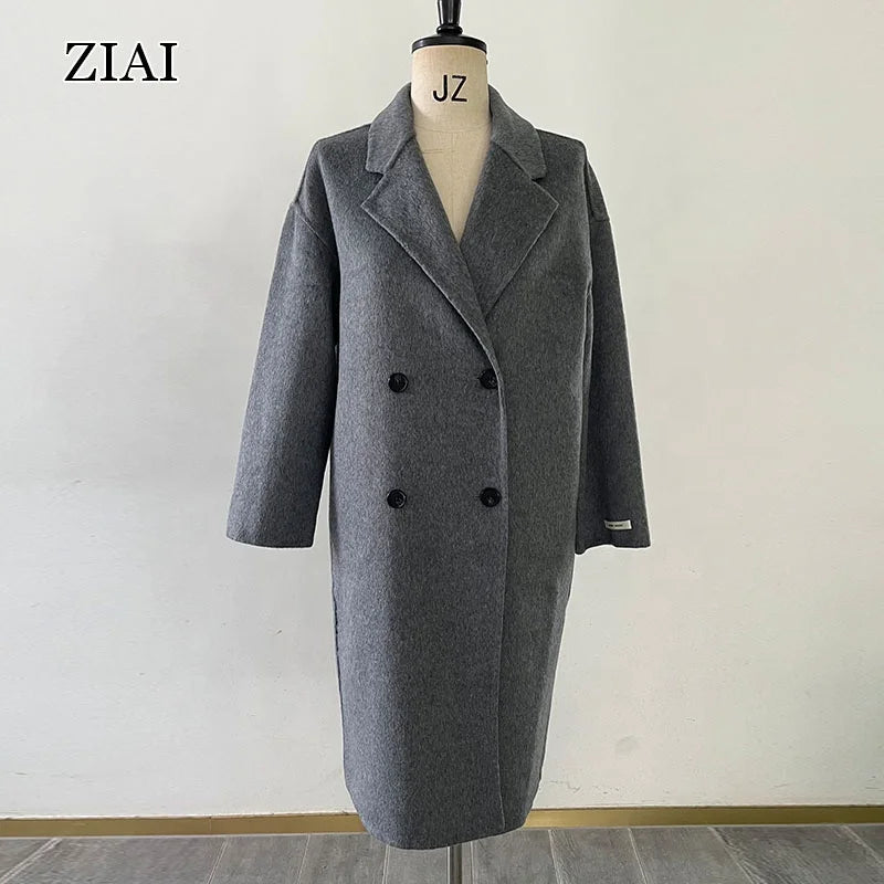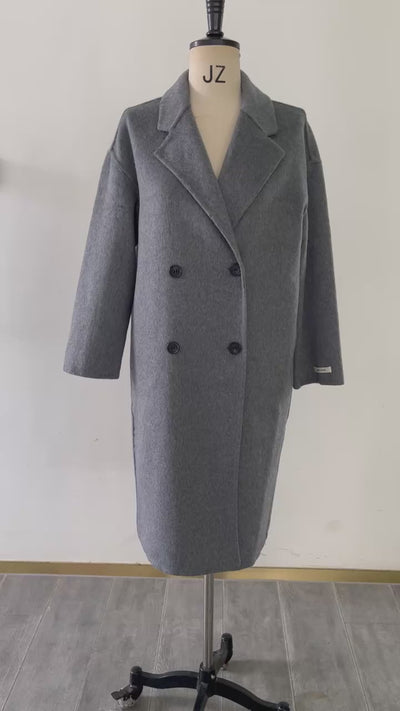 Elegant Double-Faced Design: Long gray peacoat for versatile, stylish layering.